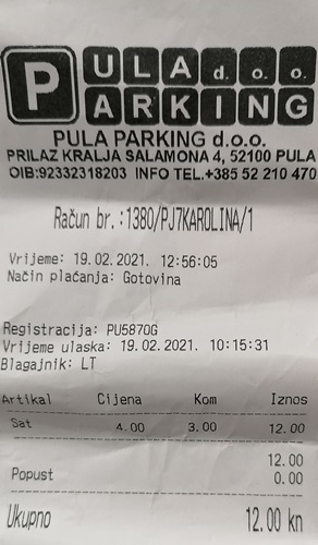 Slučajno li se zateknete u Gradu Puli u cijenu jednog umaškog parking sata u Puli vaš ljubimac može ostati čak pet sati. I gle to u centru Grada neposredno uz Arenu. A što je još značajnije o Vašem ljubimcu brine se zaštitarska služba koja nadzire parkirni prostor i automobile. I to za 4,oo kune po satu. Ako ništa više u tih pet sati možete pogledati dva otvorena Muzeja koji se nalaze uz parkiralište, Arenu i što šta još.