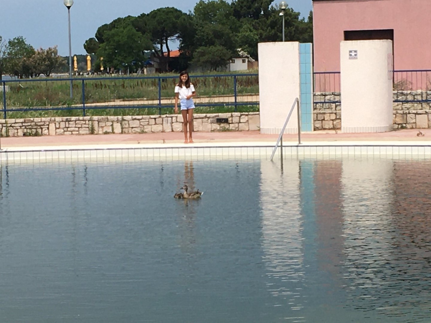 -Nedavno smo predvečer šetale mama, baka i ja po turističkom naselju Polinezija - Katoro, koje je opustjelo ovih dana jer nema turista u njemu. Bila sam na svojim rolama, a tamo rado odlazimo promatrati najljepši zalazak sunca. Volim šetnje u prirodi pred spavanje. Nebo je crveno i sunce polako, polako tone u more na počinak. I tako smo prolazile kraj zapuštenog bazena, koje zbog ne čišćenja podsjeća na baru, jer je voda u njemu zelenkaste boje. Ugledala sam u toj osami patku i dva pačića kako pliva na površini i jako gače. Baka Neda koja je biologinja rekla mi je da se radi o divljoj patki kreketaljki. Kvakala je preglasno i nemirno plivala po površini „jezerca“. Meni je izgledalo da je prestrašena ili nervozna zbog nečeg. Kad smo preskočile ogradu i primakle se bazenu, učinilo mi se da čujem nježnije glasanje patke u blizini. Ali ne, to nije bio glas poznate mame patke već je zvučalo kao glasić pačeta, no nisam vidjela nikoga osim nje na sredini bazena. Već smo htjele otići kadli sam postala sigurna da čujem kvakanje pačića, ali glasić je dopirao negdje s kraja bazena. Svi smo zastali i ja sam ponavljala pokazujući baki i mami mjesto odakle čujem glasić. Kad smo se oprezno približile čula sam više glasova pačića i rekla mami, da su možda i dva pačića očito upala u cijevi bazena, prepričava uzbuđeno Hana. U tom trenutku nisu bile sigurne može li se tu išta učiniti, pomoći nesretnim pačićima koji su se sunovratili u cijevi. Naime, baka Neda objašnjava da se radilo o rubnim dijelovima bazena, gdje se preljeva bazenska voda i ulazi kroz male, nepokrivene rupe/otvore (zimi se pokrov uklanja ) u cijevi bazena u tzv. kompenzacijski bazen ispod vanjskog bazena. Praktički se tu, ispod otvorenog bazena nalazi sustav cijevi koji je spojen s još jednim bazenom iz kojega cirkulira voda kroz oba bazena. A tom se podzemnom bazenu pristupa stubama kroz poseban objekt, kućicu smještenu u neposrednoj blizini. Znači, pačići su bili zaglavili, ili u dugačkim cijevima bazena, ili su upali na dno u kompenzacijski bazen. Male su bile šanse da će preživjeti.