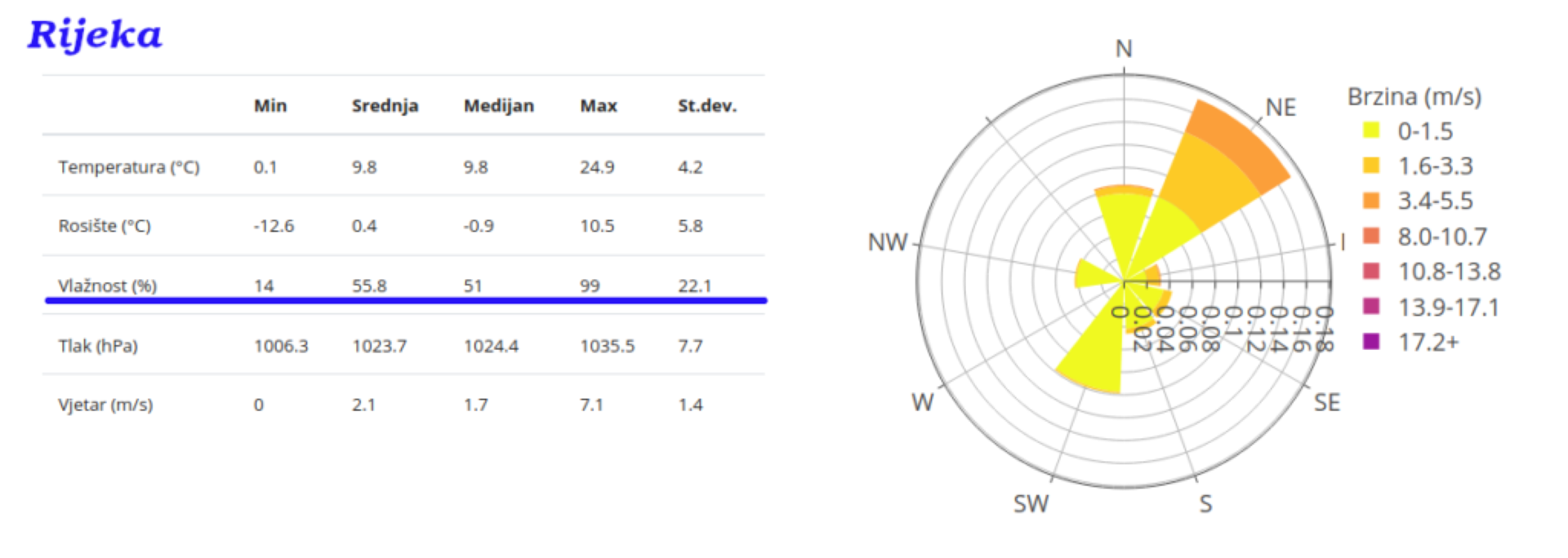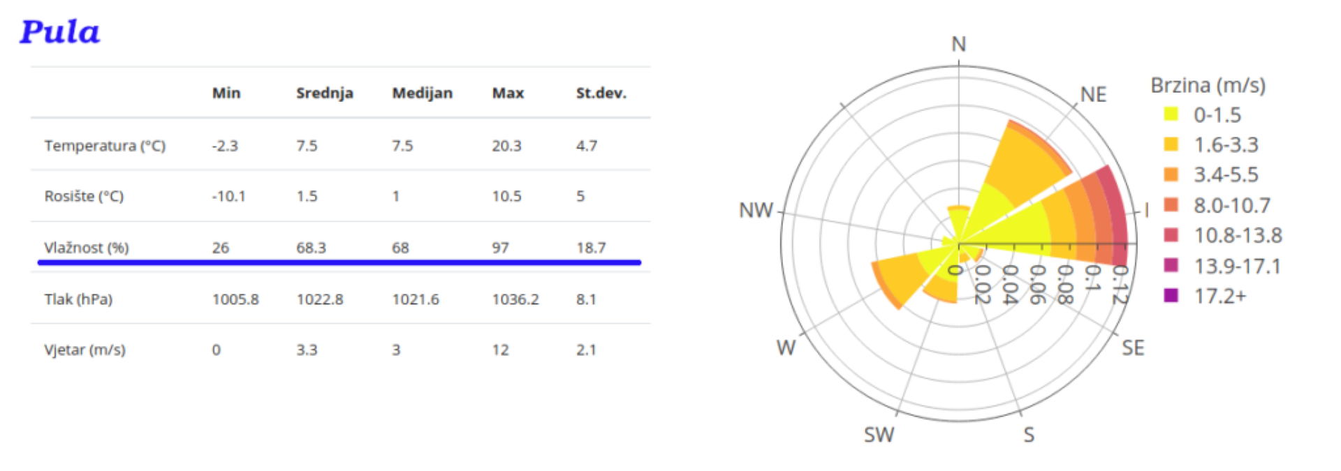 Iz prikazanih podataka vidimo da je dominantan smjer vjetra u zadnjih mjesec dana u Puli istočni, a u Rijeci sjeveroistočni. Također, vidljiva je mnogo viša relativna vlažnost u Puli (aritmetička sredina, kao i medijan = 68%), u odnosu na Rijeku (aritmetička sredina = 56%, medijan = 51%).