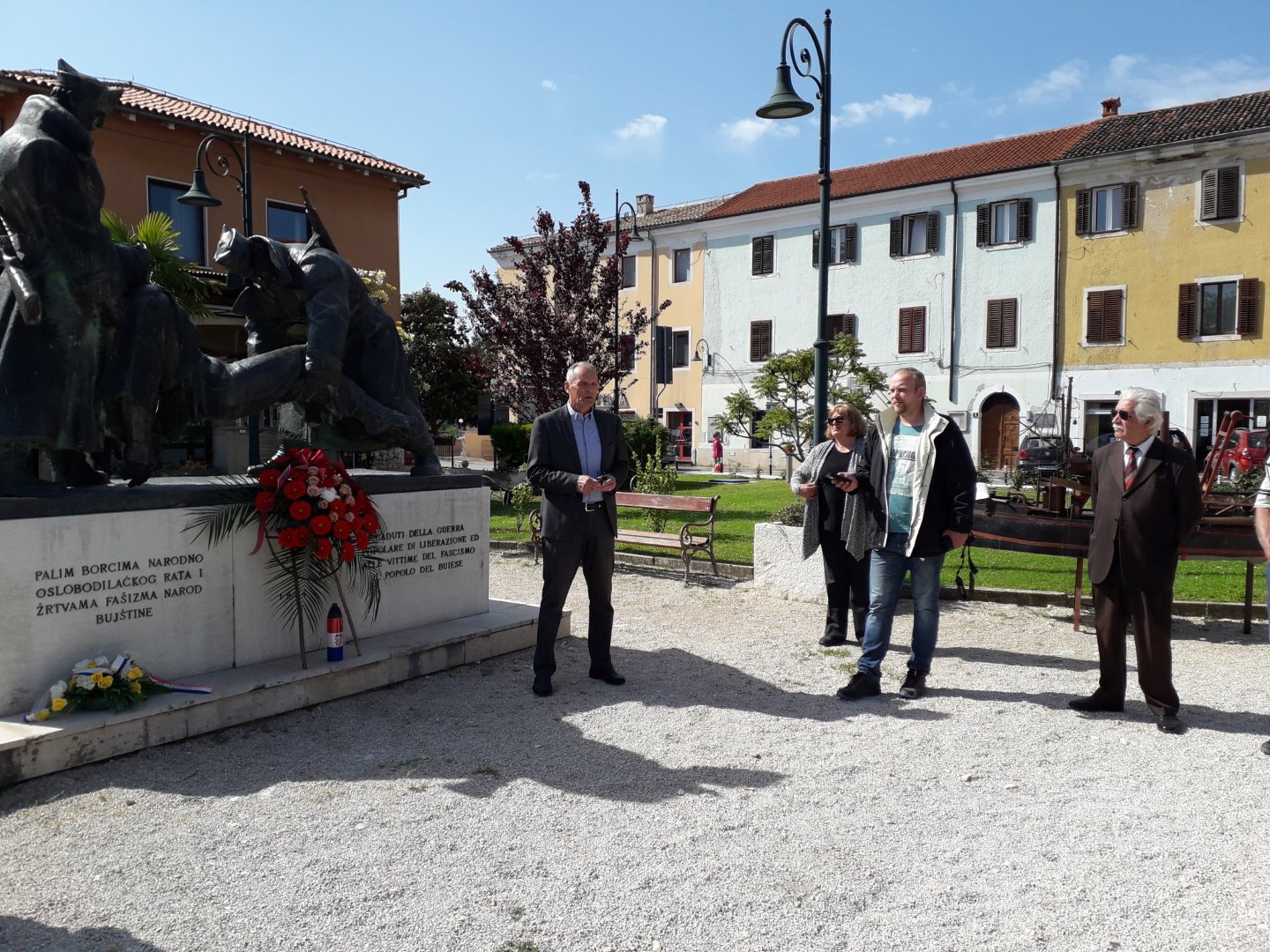 Dvjema međuzavisnim obljetnicama koje se obilježavaju na dan 9. svibnja prisustvovali su još: Rino Dunis predsjednik Gradskog vijeća Grada Buja, Edi Andreašić predsjednik Udruge antifašista Bujštine, članovi umaške i novigradske podružnice UA Bujštine, članovi Društva Josip Broz Tito i ostali članovi spomenutih udruga. Položivši vijence i upaljenu svijeću na spomen obilježje obratio se prisutnima Andreašić.