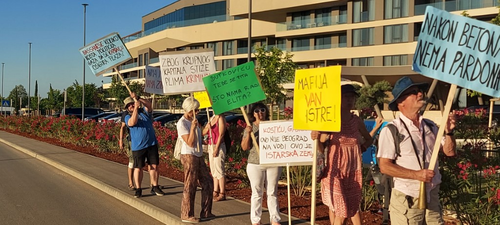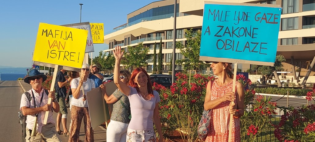 Savudrija/ Alberi – Ni svečano otvorenje resorta Petram u Alberima nije uvodno proteklo u dobrom raspoloženju. Zapaprili su ga svojim protestnim skupom aktivisti pulske inicijative ZA Lungomare i građanske inicijative Umag – Savudrija. Okupili su se uoči inauguracije novog turističkog naselja ispred središnjeg objekta aparthotela poslavši ispisanim porukama na transparentima neugodne poruke dvama partnerskim investitorima u Alberima, srpskim poduzetnicima Vojislavu Gajiću (Čista voda projekt d.o.o.) i Miodragu Kostiću (MK group, popularni „kralj šećera“), te lokalnom ulagaču, u figuri gradonačelnika Grada Umaga Viliju Bassanseu investitoru u obalnu cestu -šetnicu na pomorskom dobru. Poradi realizacije projekta šetnice u Alberima trajno je uništen dio stjenovite obale, jedinstvene na ovom dijelu Jadrana. Prepoznatljive vizure kao identitet Savudrijske vale nestaju zauvijek pod naletima bagera. Da stvar bude još gora ista će prvenstveno biti u funkciji dva turistička naselja, poveznica plaže Petrama i plaže Kempinski, a stanovnicima Umaga mogla bi poslužiti kao jednokratno utažena znatiželja posjetom ovoj destinaciji, dok će vrlo rijetki planirati kupanje na plažama u koncesiji spomenutih vlasnika, Kostića i Gajića.